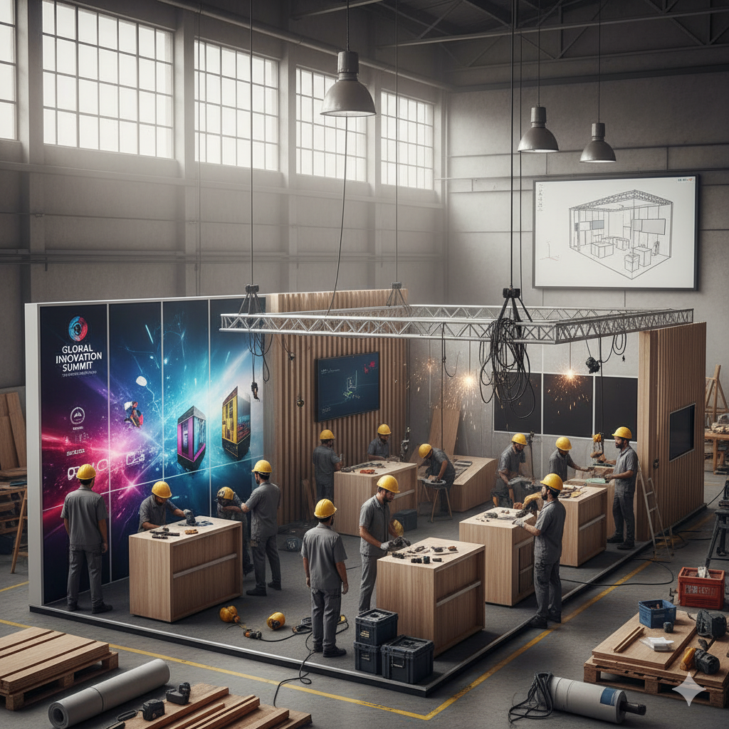 The physical construction and building of the exhibition stand based on the approved design. This involves managing materials, structural integrity, lighting, graphics installation, and logistics. It's the process of transforming the design blueprint into a tangible, ready-to-use display space, ensuring quality, safety, and timely setup at the venue.